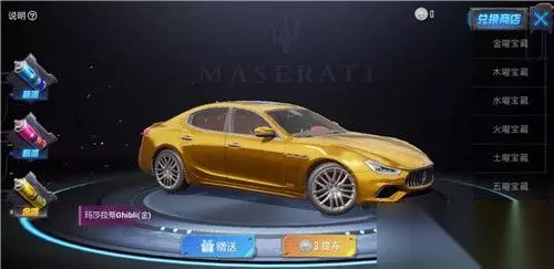 玛莎拉蒂皮肤怎么获得 这个是扭蛋碎片方式的转盘,也就是说可以自己抽,也可以买别人抽到的玛莎拉蒂车钥匙,一般这种直接买比抽划算,抽的话一般1000一个钥匙,金色车需要三个钥匙,也就是3000左右,而买的话之前市场价是600元一个,也就是1800元金色玛莎。 想要玛莎拉蒂的小伙伴喜欢的话可以参考以上的获取方式进行获得。