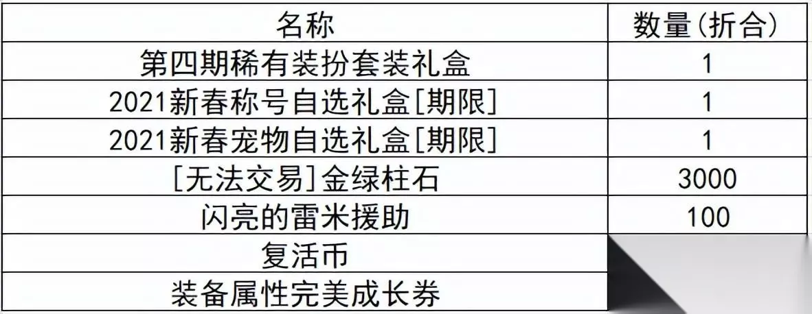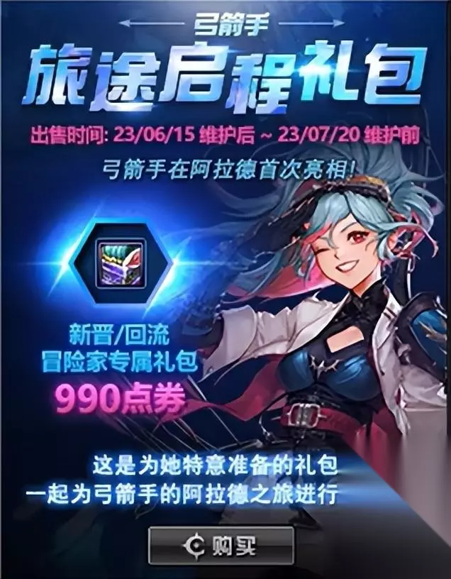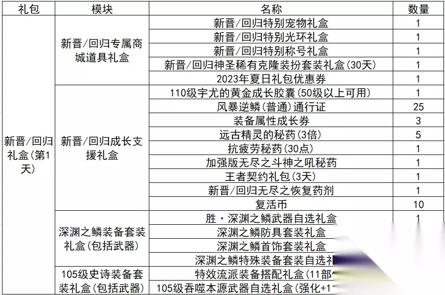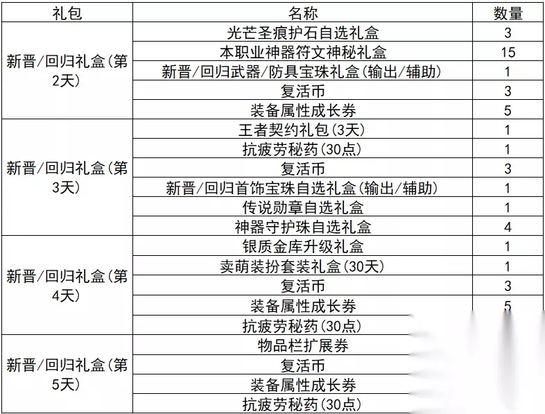 只有新晋/回归勇士可以购买的礼包,售价990点券,打开之后可以获得一个王者契约礼包(7天)、一个复活币礼盒(30个)、一个闪亮的雷米援助礼盒(100个)、一个抗疲劳秘药(30点)、一个土罐的袖珍罐礼盒(10天)。