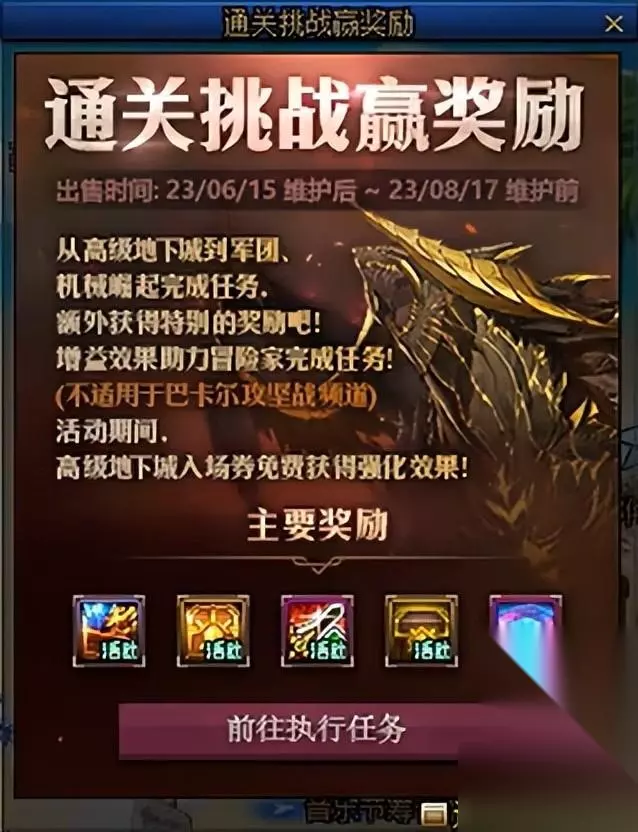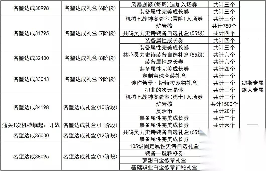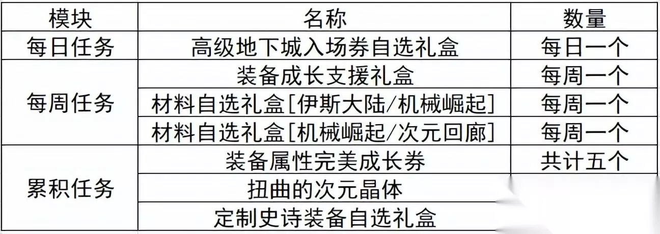 通关高级地下城、军团地下城、机械崛起可以完成每周任务,累积完成每周任务还可以获得累积完成奖励。下面是奖励详情: