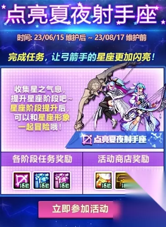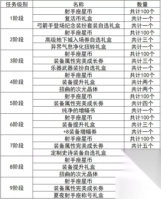 通过日常游戏内容即可完成每日任务、每周任务和特别任务,可以获得消耗品、星之气息和射手座星币。星之气息可以提升任务级别,以获得任务阶段奖励;射手座星币可以在夏夜旅人商店当中兑换奖励。下面是奖励详情: 阶段奖励:
