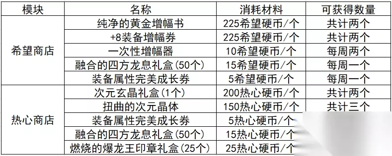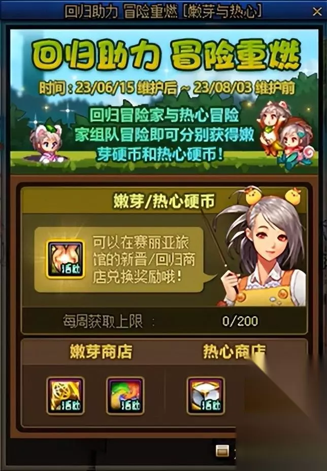 活动期间,回归勇士与常驻勇士组队通关地下城分别可以获得嫩芽硬币和热心硬币,使用希望硬币和热心硬币可以在嫩芽/热心硬币商店兑换奖励。下面是奖励详情: