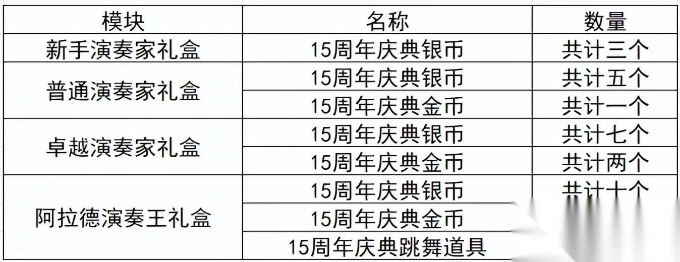 通过15周年欢乐答题、乐队和茉霓的特别舞台两个活动可以获得15周年庆典金币和15周年庆典银币,使用金币和银币可以在15周年庆典向导商店当中兑换奖励。下面是奖励详情: