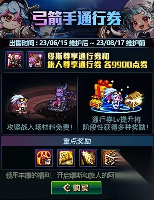 弓箭手专属通行券,旅人和缪斯分别可以购买一个,两者的奖励相同,使用9900点券可以解锁尊享奖励,通行券可以帮助新职业快速成长。弓箭手专属通行券也分为普通奖励和尊享奖励,下面是奖励详情: 普通奖励: