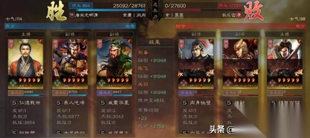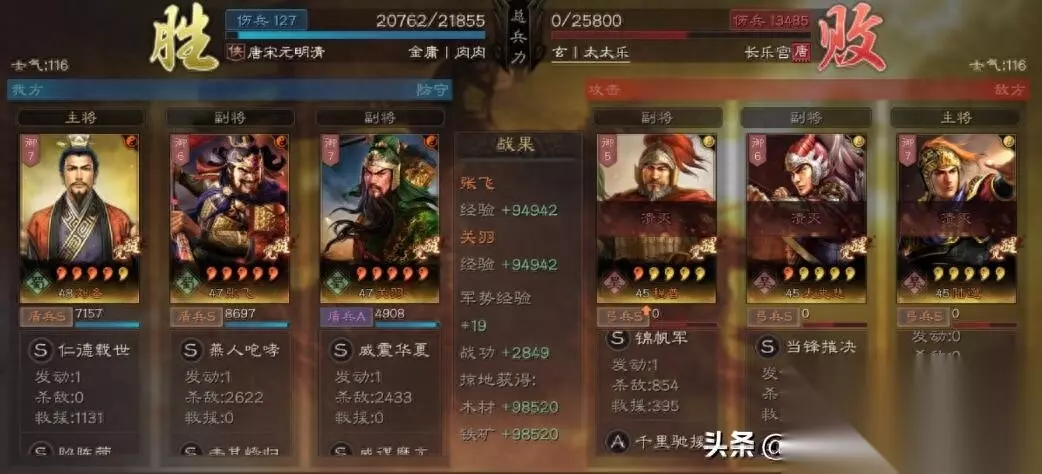 主将用刘备,战法带——陷阵营+暂避其锋 副将用张飞,战法带——击其惰归+刚勇无前 副将用关羽,战法带——箕形阵+威谋靡亢 战报一:低损吊打一波麒麟弓。