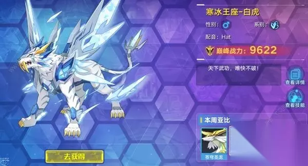 性别:男 巅峰战力:9622 获得方法:通过白虎降临活动抽奖获得白虎一态、进化和突破。活动抽奖需要消耗白虎币,白虎币通过参与冰块争夺战活动获得。 冰块争夺战活动开放时间:每天11:30-14:29 18:30-21:29 系别:冰系 白虎技能表