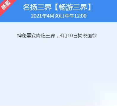 名扬三界【畅游三界】开服时间介绍 开服时间: 2021年4月30日中午12:00 官方介绍: 神秘嘉宾降临三界,4月10日揭晓面纱。