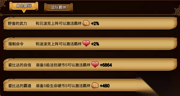 1、野蛮的武力:和贝波克上阵可以增加2%的物理攻击 2、强制命令:和波波克上阵可以增加2%的生命 3、爱比达的自信:装备S级法抗硬币S可以增加6864的生命 4、爱比达的霸道:装备S级生命硬币S可以增加480的物理攻击