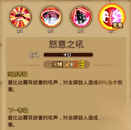 无双技能:怒意之吼 技能介绍:三线攻击,爱比达震耳欲聋的吼声,对全屏敌人造成法术伤害。 这个无双技能非常经典,因为它在原著中进一步压得可比抬不起头。回想若干时间后的可比会变成勇敢成熟,更是让人印象深刻。 接下来是瘦版 角色羁绊