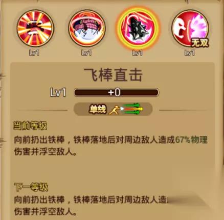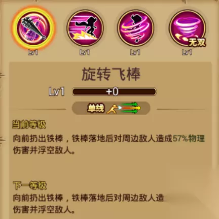 普通技能:旋转飞棒 基本介绍:单线范围,向前扔出铁棒,铁棒落地后对周围敌人造成部分物理伤害并浮空敌人。 犹记得当初那些被迷住的官兵是怎么倒下的……
