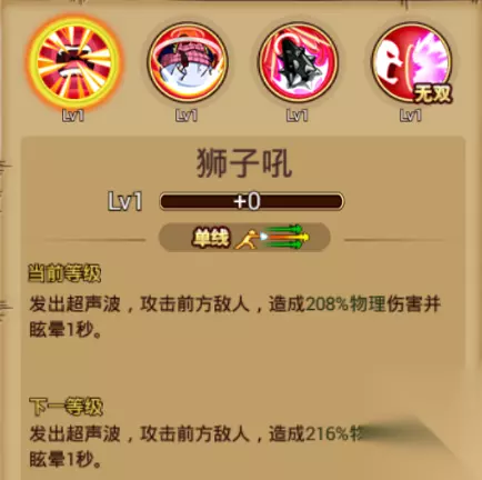普通技能:狮子吼 技能介绍:单线攻击,发出超声波,攻击前方敌人,造成大量物理伤害,并眩晕1秒。 当初“弱小”版的可比就是被这样的技能搞的抬不起头来。