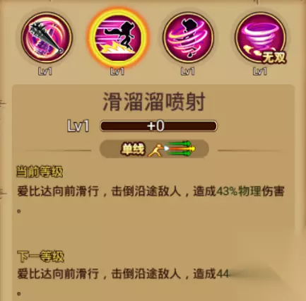 普通技能:滑溜溜喷射 基本介绍:单线范围,向前滑行,击倒沿途敌人,造成部分物理伤害 因为吃了滑滑果实,爱比达的敏捷度也瞬间提高。在原著中,爱比达会打赤脚并通过斜板加速,如穿溜冰鞋一样滑行。