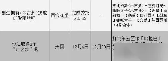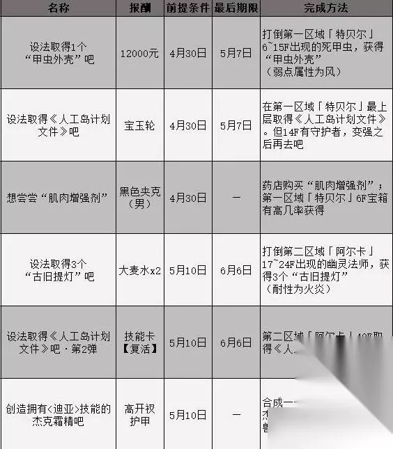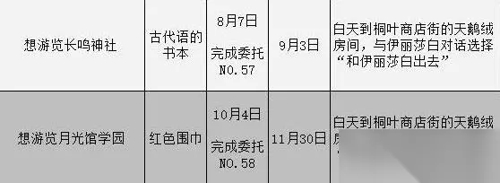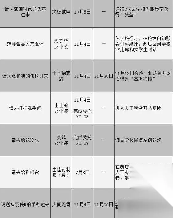 委托攻略汇总表 小提示:所有委托任务都由天鹅绒房间助手发布。 选择男主时,委托将由伊丽莎白发布;选择女主时,可以选择伊丽莎白或迪奥多担任天鹅绒助手,之后会由选定的助手发布委托。 委托将在4月30日解锁,在这一天会接到伊丽莎白/迪奥多的电话,TA表示有事情要与你商谈,并请你前往天鹅绒房间。之后从桐叶商店街进入天鹅绒房间,就可以从伊丽莎白/迪奥多那里接取委托任务了。 委托任务一览表