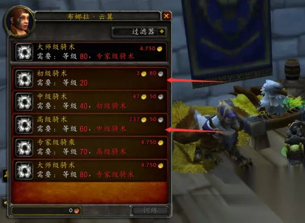 第五步,在骑术训练列表里面可以看到所有的骑术,高级骑术需要475金币。 怀旧服骑术训练师在哪? 魔兽世界中飞行骑术训练师有很多地方都有,其中4大主城,每个主城都有各自的训练师。以及在达拉然和潘达利亚等地方都是有的。而潘达利亚飞行只能选择在潘达利亚学习。 飞行训练师的具体位置如下: