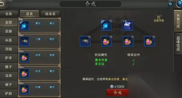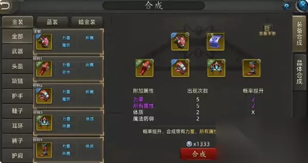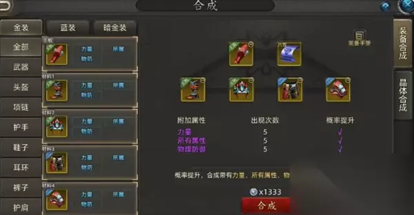 相较于蓝装,金装的合成就显得更具策略性,不同的词条继承方式会直接影响合成效果,以下是几种主流合成方案: 【55合成法】:此方式为三词条×5次的高效合成方案,需使用主板加五件材料装备,每个词条需在材料中出现5次以上。这种方法虽然门槛高,但对平民玩家来说是最稳定的方式,难点在于搜集五件完全相同词条的装备。