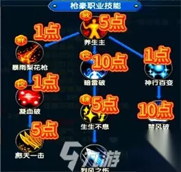 枪豪加点: PVE刷怪:优先点满暴雨梨花枪(10点,群体AOE)和禁风破(10点,范围减速),生生不息加5点提升续航。 PVP竞技:侧重养生主(5点,加生命值)和暗雷破(10点,爆发伤害),舍生一击加5点增强抗伤能力。 属性加点:优先体质(血量),其次力量(攻击)。