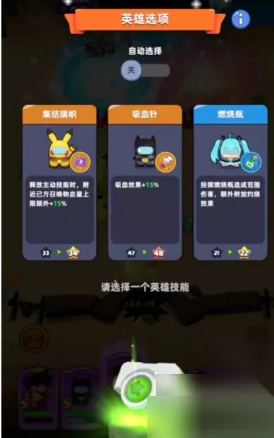 三、英雄技能选择策略 游戏进行到一定阶段,将出现英雄技能强化选项。优先选择提升伤害的技能。若生存能力较弱,则选择提升吸血效果或防御能力。 针对不同敌人,选择合适的技能至关重要:面对高血量敌人,选择破甲或增伤技能;面对高防御敌人,则选择提升攻击力或穿透能力。 记得在英雄能量积满时释放技能!