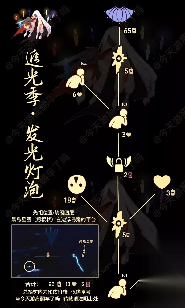 1、光遇4.7复刻先祖位置在禁阁四层,晨岛星图(拐棍状)左边浮岛旁的平台。 2、兑换三角额纹面具、幽蓝斗篷、噤声动作所需价格为2根红蜡烛、96根白蜡烛、13颗爱心,兑换树内为预估价格,仅供参考。 3、复刻时间为本周四早上6:00至下周一中午12:00,即4月7日早上六点到4月11日中午12点,过时不候哦。