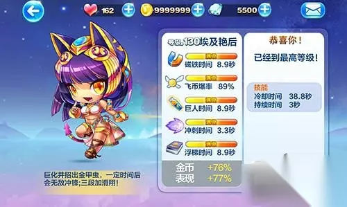 天天酷跑 ☆满级属性技能☆ 满级130级、磁铁时间8.9s、飞币爆率89%、巨人时间8.9s、冲刺时间3.3s、浮梯时间8.9s、金币+76%、表现+77% 技能冷却时间38.8秒、持续时间3秒 角色技能: 1、发动技能,角色巨化并招出高分金甲虫 2、金甲虫可增加进度条的值,一定时间后角色会疯狂无敌冲锋 3、三段跳加滑翔,大眼萌鹰可抵消一次死亡 ☆多人对战☆ 埃及艳后在多人对战中技能变大冲锋可以帮助很多撞柱子和钉子的手残玩家们,但是得分不稳定,好的时候两分钟内也是有可能的,但是大多数情况下比不过暗黑大圣和龙马的组合,不推荐在多人对战中使用! ☆搭配测试☆ 1、埃及艳后+皇家狮鹫+暴风雪女+绿巨熊 2、埃及艳后+九色鹿+暴风雪女+熊队长 3、埃及艳后+沙滩摩托+暴风雪女+战争熊器 在搭配上埃及艳后算比较百搭的了,配皇家狮鹫是破坏流、搭配九色鹿是飞星流+超级奖励、搭配沙滩摩托是飞星流+飞行,无论是哪种流派都可以轻松驾驭! ☆总体评价☆ 埃及艳后有两条命,增加了这个角色的保命能力,触发技能后一个金甲虫的加分是20000分,虽然是破坏流派的角色,但是在超级奖励中使用技能得分会很高,一套超级奖励出来大约是500W分,总体来说这个角色在酷跑模式中的得分能力还不错,但是多人对战就比较差,毕竟是黄金奖池中第一位女性角色,因此还是推荐入手的! 欢迎玩家下载天天酷跑安卓ios客户端,只需要在百度输入【天天酷跑233乐园】就可以直接下载安装包,同时天天酷跑攻略专区提供天天酷跑及天天酷跑攻略。好玩的手机网游下载尽在233乐园。 如转载涉及版权等问题,请作者与我司联系,我司将在第一时间删除或支付稿酬。