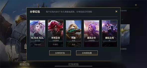 进入任务界面后会看到有三个界面,分别是”超级红包“、”红包奖励“和“端游玩家反馈”。超级红包可以分享给自己的五位好友,让你的好友帮忙点击,点击后好友则可以获得皮肤或者英雄奖励。当你同时分享给五个好友之后,你就可以看到你的五位好友获得的皮肤了。