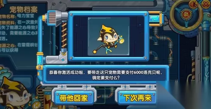 3、“电力宝宝”失去了能量,如果你能去“雷霆峡谷”找到他的“能源之心”,并把充电电路连好,就可以激活“电力宝宝”,并且花费6000洛克贝,把宠物带回家。