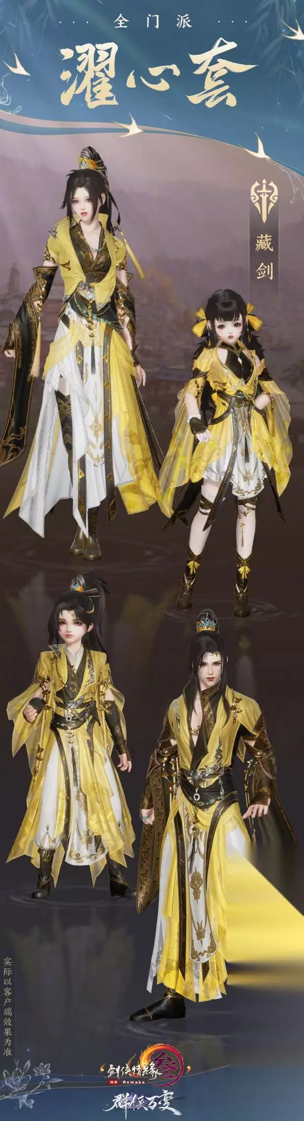 6、藏剑 淡看风云,笑听雷霆,藏剑“濯心”套玄袍为底,黄衫覆之,不规则的设计凸显其洒脱不羁!几缕银杏袖间自然垂落,暗纹如烟萦绕周身,剑锋千仞更显尊贵!天地间侠气凛然,负剑画巍峨山水,舍我其谁。