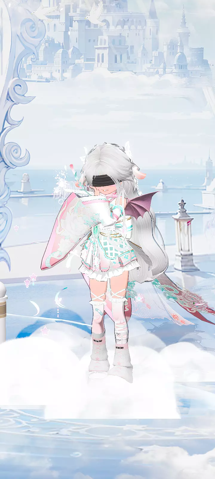 -✔️配饰:黑色眼罩遮挡眼部(增添神秘氛围),背后一对粉紫渐变小恶魔翅膀(妖族标志性元素),还有灵动飘带点缀,强化奇幻感。#吗喽精选#申请精华