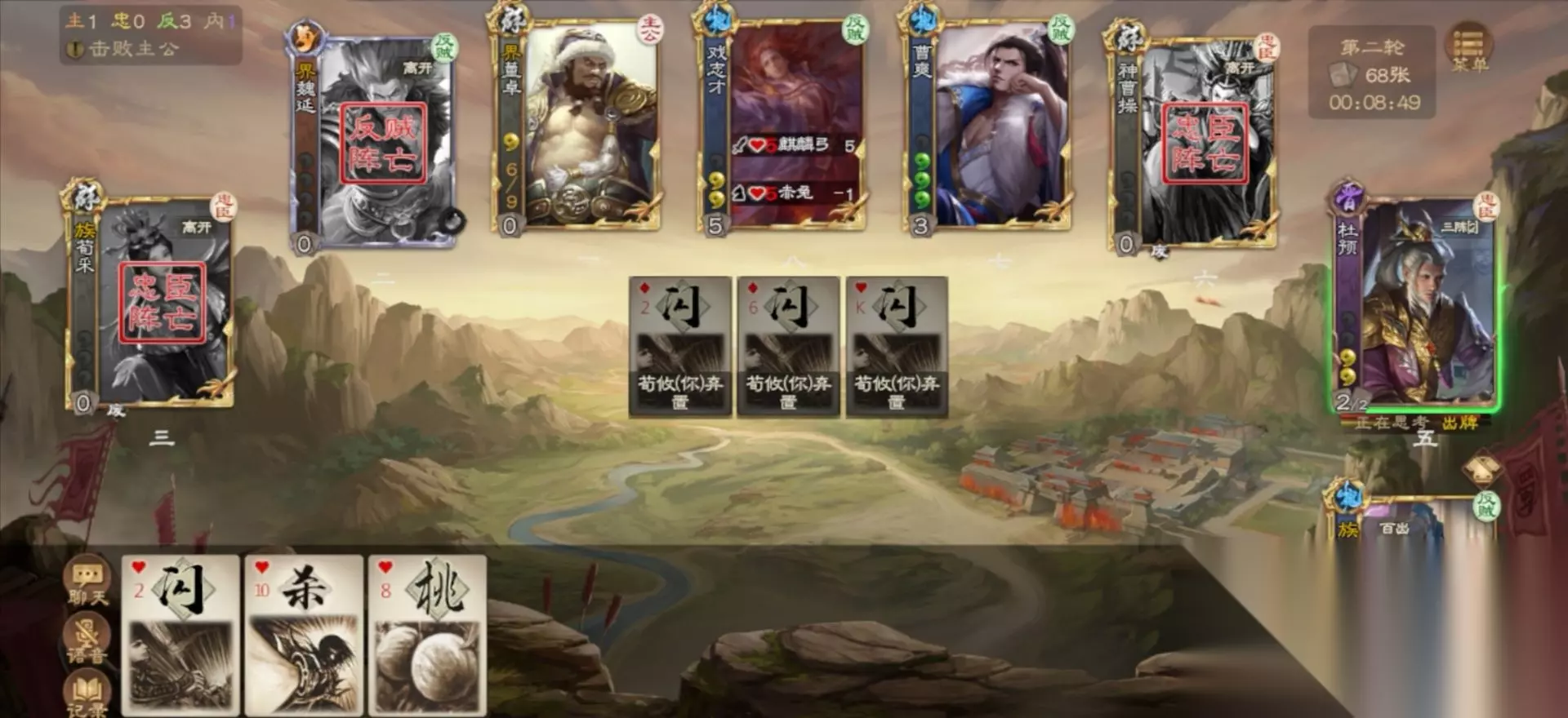第一把我是四号位族荀攸,身份为反。开局7号位何太后给主喂酒(身份存疑),6号位贾充对主公使用凶竖(标反)。主公开局放万剑,铁索3号位左慈和贾充,雷杀左慈,左慈出闪(标反)。2号位荀淑记录了钟毓的过拆,阶段结束时对族钟毓使用(标反)。族荀淑中了万剑被何太后下酒后决斗主公砸脚濒死,喝酒自救。5号位sp蔡文姬给主公族钟毓【陈情】(标忠)调整手牌。3号位被何太后下酒,选择马术酒杀主公被闪结束回合。到了我自己的回合,何太后继续下酒,贾充算了算人头,觉得我是忠臣也对我用了凶竖。通过手里俩桃的使用获得了奇策,本想通过使用无中生有递牌给荀淑增加防御(还剩桃、闪、闪),奈何族荀攸有bug无法【蹈节】给同族牌。通过无中摸到杀、+1,杀sp蔡文姬一刀自证身份结束回合。sp蔡文姬断杀过。贾充没距离过。何太后断杀过。8号忠臣族王允,使用了俩次【解悬】、杀了贾充和族荀淑【铭戒】了我和贾充结束回合。主公回合杀荀淑,我出桃捞起来了。左慈强袭带走主公,第一把成功拿下。