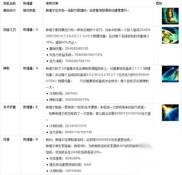 英雄属性 生命值:378 (+82 / 每级) 魔法值:203 (+25 / 每级) 移动速度:340 攻击速度:0.679 (+3.1% / 每级) 护甲值:12.75 (+3.3 / 每级) 魔法抗性:30 (+0 / 每级) 攻击距离:425 生命回复:4.25 (+0.55 / 每级) 魔法回复:0.3 (+0.5 / 每级) 英雄技巧 自己使用 希维尔的回旋之刃在到达最远射程后会飞回她手中,因此在扔出后你可以调整位置使它更容易命中敌人。 弹射会立刻重置希维尔的普通攻击,所以在进行一次普攻之后立刻激活它,就能最大化伤害输出。 尽量留着法术护盾,来帮你抵挡那些可以限制你的技能,例如:晕眩和束缚。 敌人使用 回旋之刃会消耗大量法力值,躲避该技能会让希维尔受挫。如果她在扔出去时击中了你,在其返回时你要避免再次被击中。 希维尔是一个强大的推线英雄,所以如果任由她独自推线的话,你将发现己方的防御塔很快就被摧毁了。 当你使用一个法师与希维尔对线时,你可以假装压上施法再退回,来诱骗她用掉法术护盾。