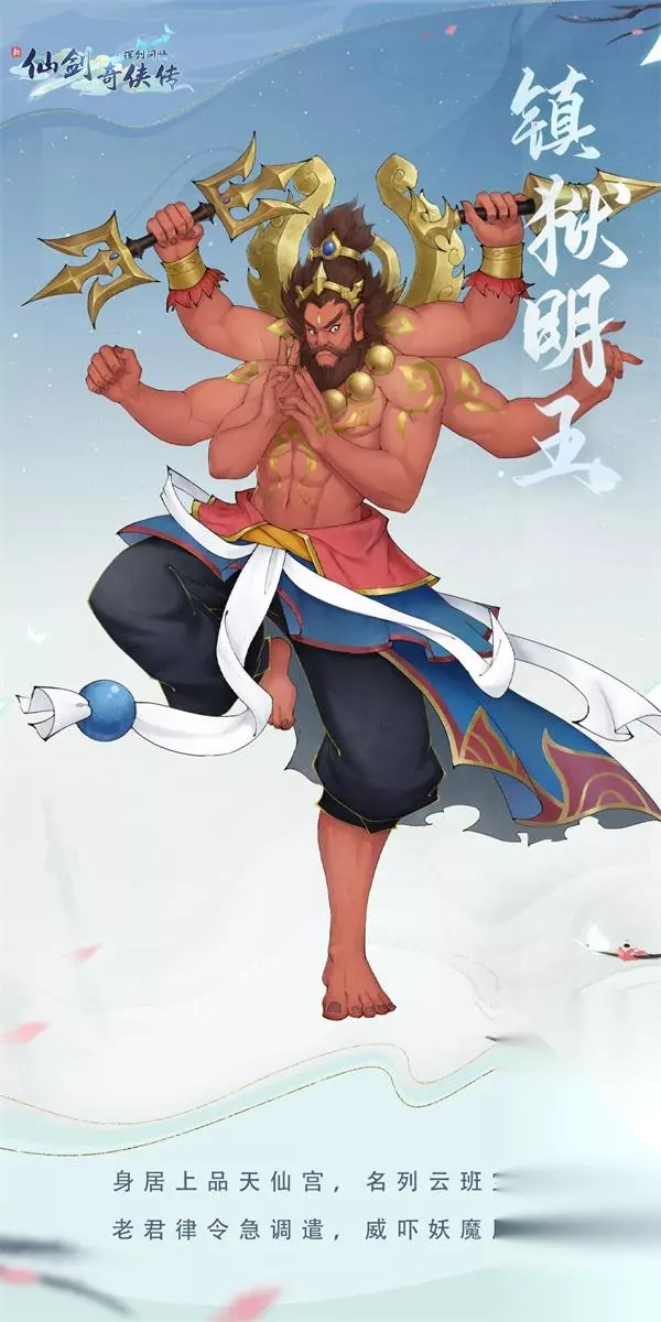 由于赵灵儿被蜀山剑圣独孤宇云关进锁妖塔,锁在其中最大的一根龙柱上。李逍遥和林月如入塔相救,作为看守锁妖塔的镇狱明王现身阻止。镇狱明王与李逍遥、赵灵儿、林月如三人战斗,被击毙。之后三人击碎了锁妖塔下的七星盘龙柱,锁妖塔坍塌。 ★主动特技:地裂天崩★ 主动特技地裂天崩,对敌方人数最多列的目标造成物理伤害,并有高概率附加土毒,并且能回复自身血量。 关于镇狱明王的生平介绍大致就到这里了~镇狱明王虽然只是锁妖塔中的看守之一,但是实力强大,当年的李逍遥三人可是在他手中吃了不少的亏!另外镇狱明王的其他形象在仙剑3中也有体现,下次有机会的话花楹再给大家详细的介绍。 *以上内容以最终游戏内上线为准