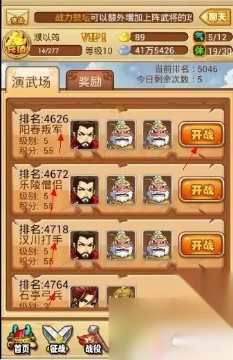 点击前往之,看到战场,我一身的细胞就荡漾起来了,热血沸腾,哈哈!进入演武场界面,引入眼帘的是: