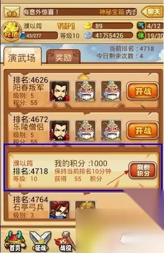 胜利之后,自己的演武场排名就会提高!同时获得演武场积分!查看积分的方法如下图所示: