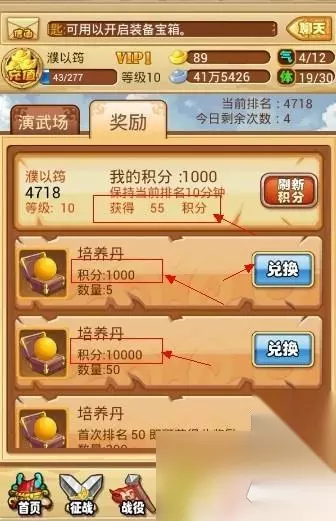 这里有一个刷新积分的按钮,你可以实时刷新积分排名情况哦!另外,演武场积分是非常有用的。因为它可以用来换取:“培养丹”(武将培养的时候需要用到),积分也挺好刷的。具体兑换奖励界面如下图所示: