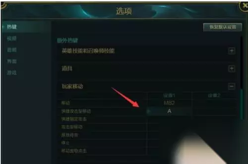 7. 下面有个玩家移动选项,我们把里面的快捷移动型攻击改成A,然后点击确定。