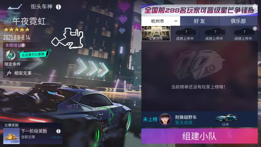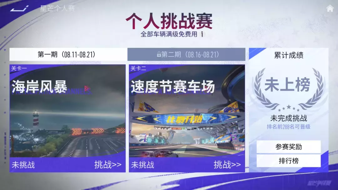 1、【街头车神】:8月8日~8月14日,该期的街头车神结算时的全国前288名车手,将会晋级到后续的【晋级赛】中。