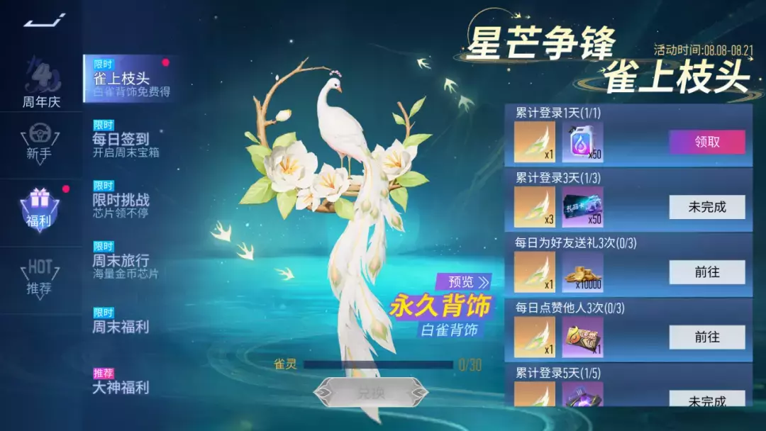 星芒争锋,雀上枝头。8月8日~8月21日,参与活动任务即可获得道具“雀灵”,收集雀灵道具可以兑换永久背饰:白雀背饰。白玉灵雀栖肩畔,云裳仙姿展翼间。各位车手记得一定要兑换呦。