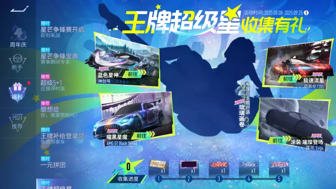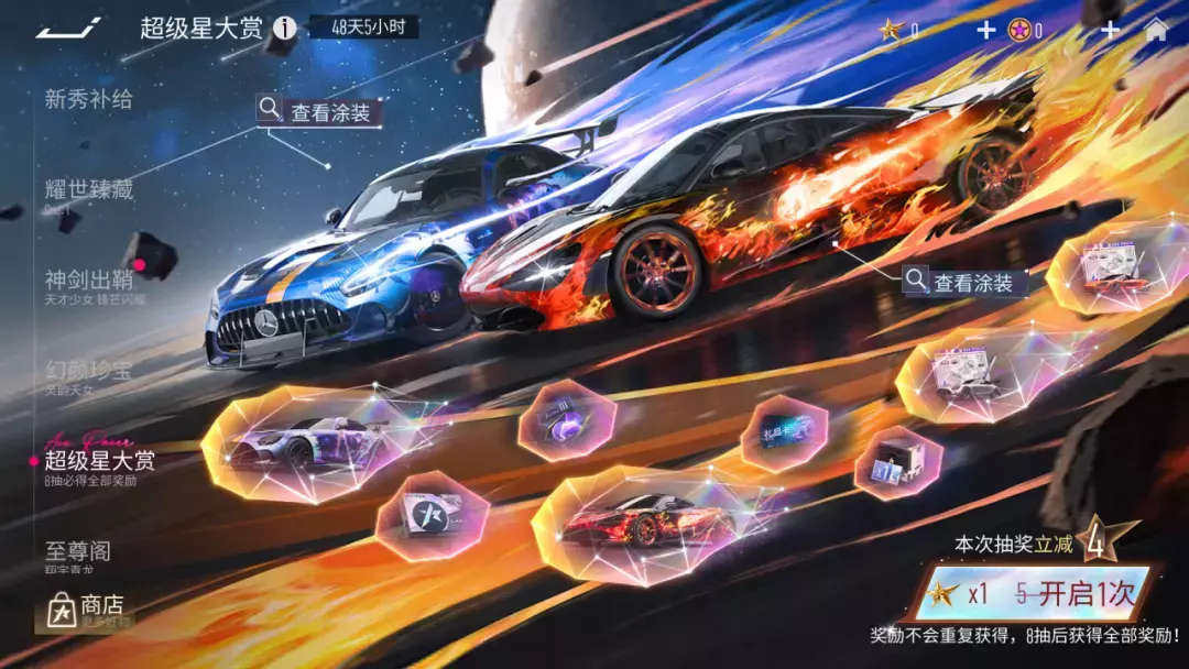 8月8日起,超级星大赏活动正式开启,车手们使用超级星道具(可用绑币购买)即可参与抽奖~本期奖池共有8个奖励,包含王牌超级星系列涂装『曜星黑魔』以及『极速流星』,每次抽奖必得奖励,抽取8次必定获得全部奖励哦~