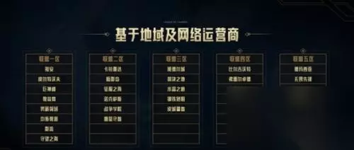 LOL跨区匹配有哪些区 一、联盟一区 大区组成:祖安、皮尔特沃夫、巨神峰、教育网专区、男爵领域、均衡教派、影流、守望之海 二、联盟二区 大区组成:卡拉曼达、暗影岛、征服之海、诺克萨斯、战争学院、雷瑟守备 三、联盟三区 大区组成:班德尔城、裁决之地、水晶之痕、钢铁烈阳、皮城警备 四、联盟四区 大区组成:比尔吉沃特、弗雷尔卓德、扭曲丛林 五、联盟五区 大区组成:德玛西亚、无畏先锋、恕瑞玛、巨龙之巢 六、独立大区 大区组成:艾欧尼亚、黑色玫瑰、峡谷之巅
