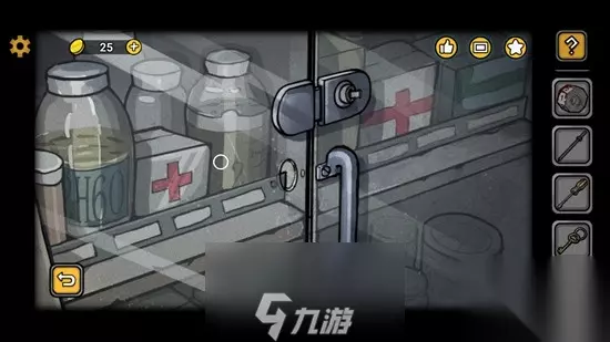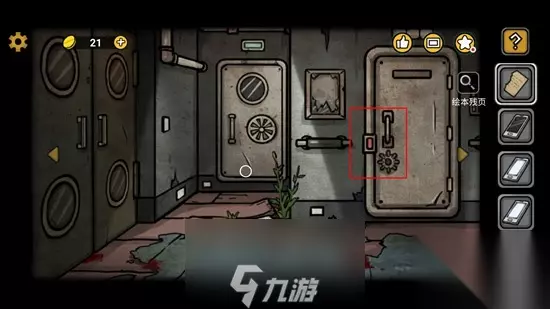 13、船舱里直接右走到下图区域,点击红框处医务室,依照之前一号船员室海报给的提示将门锁设置,开门进入。