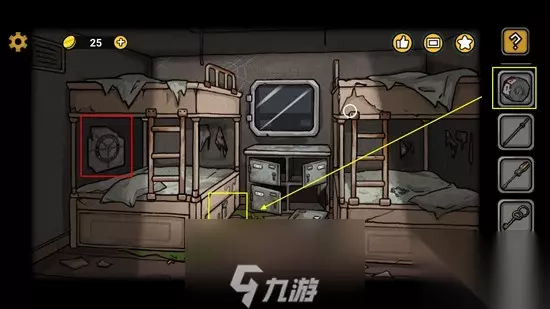 18、前往一号船员室。左侧黄框床下面的密码柜点击放大后使用之前医务室得到的密码锁按键。顺便提一下,装上按键后的密码就是之前红框处海报右下角翻起后的那串罗马数字。输入密码:74617,打开后看见奥莉的尸体。