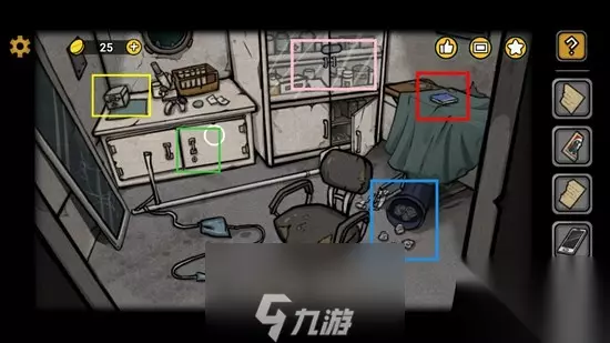 17、回到现实世界后,红框处点击放大,看见里面的提示,同时右边有书写的印记现在不能做什么,左边三个红色首字母是密码提示:HOK(意思是希波克拉特斯,学医的同志都知道)。之后下图黄框处的药箱直接输入之前看见的HOK提示,打开箱子后得到钥匙,钥匙直接对绿框处柜子使用,打开后得到椅子螺丝刀头,同时得到SG-01柜子的钥匙(在机舱往右的冒蒸汽房间)。蓝框处点击后垃圾桶里翻找找到密码锁的按键(一号船员室床下面的密码柜使用)。