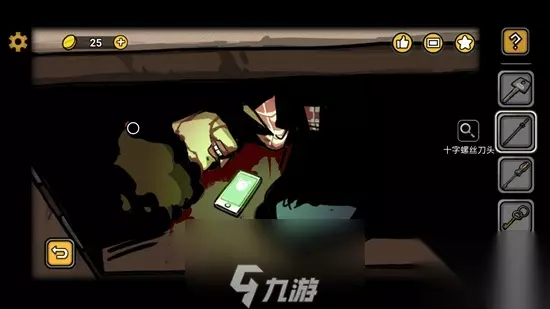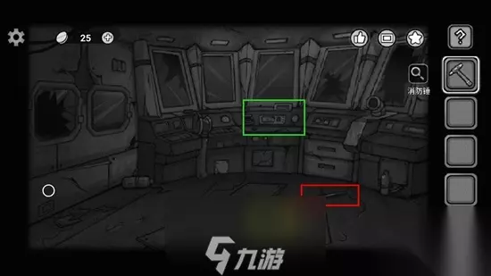 15、回忆中,红框点击后得到线索,然后向左走,用消防锤对已经有裂纹的玻璃使用,打碎后进入驾驶室。