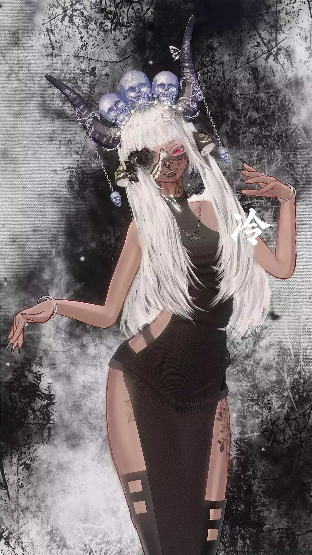 这是一位名为骼骨的魔族,头戴装饰着骷髅头与弯角的华丽头饰,银白色长发垂落,搭配黑色玫瑰眼罩,单眼露出猩红瞳孔。身着剪裁大胆的黑色连体装,腰间与腿部的破洞设计增添邪魅感,大腿两侧的花纹纹身更显神秘。她侧身而立,双手姿态妖娆,黑色长指甲与金属配饰点缀其间,背景的灰暗裂纹与烟雾效果,进一步强化了哥特式的魔族氛围#我是穿搭至尊 #申请精华#吗喽精选