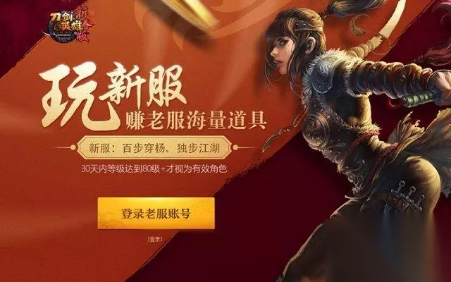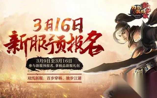 新服预报名 好礼拿不停 【勇进新服 挣钱冲级指南】 3月16日,两组双线五区新服【百步穿杨】和【独步江湖】公测同日开启。 “未老宝刀”再来袭!账号注册时间越早获得红利越多,更能获得秒升2转99礼包,得“纵横江湖”绝版护符。新服冲级赛再次开启,到达1转60级前1000名新服老玩家即可获得丰厚奖励。每个新服务器都将开放千名名额,可以说是只要回归的老玩家在规定时间内达到1转60级,将人人有奖!最高可得60000元宝! 还有多倍经验大放送!活动期间,全服开启200%经验奖励。速速新服报道,我们一起并肩作战吧! 【全民红利 都是你们最爱的】 活动期间,等级≥80级的玩家可以在红利商人处进行账号鉴定,即可一次性获得大量红利。不仅如此,参与干戚重生、武闱、纣魔重生和开活跃宝箱可得红利,老友玩家可得额外红利,红利可在红利商人处购买各种珍稀实用道具! 活动期间,≥80级的玩家上线可获得21天有效期的天降大礼包,玩家每天在线满15、40、90分钟可点击打开领取各种道具奖励。且等级≥80级的玩家每天点击日历签到可得绑定奖励,签到20天神秘好礼! 活动期间,符合条件的玩家每天可以到洛阳(136,161)剑一处,对话领取“剑意”BUFF和30点红利,每天限领一次,BUFF不能叠加。还可以每天可在洛阳城阿蝶处免费领取宠物外观激活道具,每天限点一次,连续领取六天可获得全部道具。