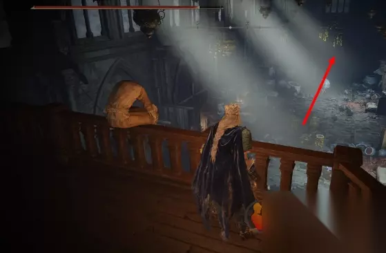 6、随后使用梅瑟莫的火种把BOSS背后的树烧掉,然后来到赐福艾尼尔·伊利姆外墙,如图所示一路到达赐福神之门:门前楼梯平台。击败最终BOSS并且触碰记忆获得头盔-光芒头冠。