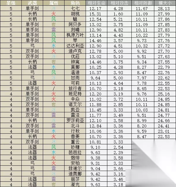 那么通过这张表格能看出什么呢? 以圣遗物所加成的生命攻击防御三项数字之比作为三者之间的比例系数,将角色的基础属性除以反应系数得到角色的相对属性,以三条相对属性之和得到角色的模,我也跟着计算了一下,结果如下图: 星级