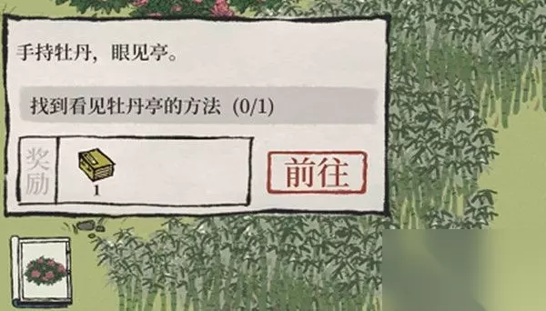 2、任务的内容是手持牡丹,眼见亭,还给了六簪牡丹访亭台的提示信息。 3、需要前往地图的左侧和下面位置探险,这里有大片的牡丹花丛。
