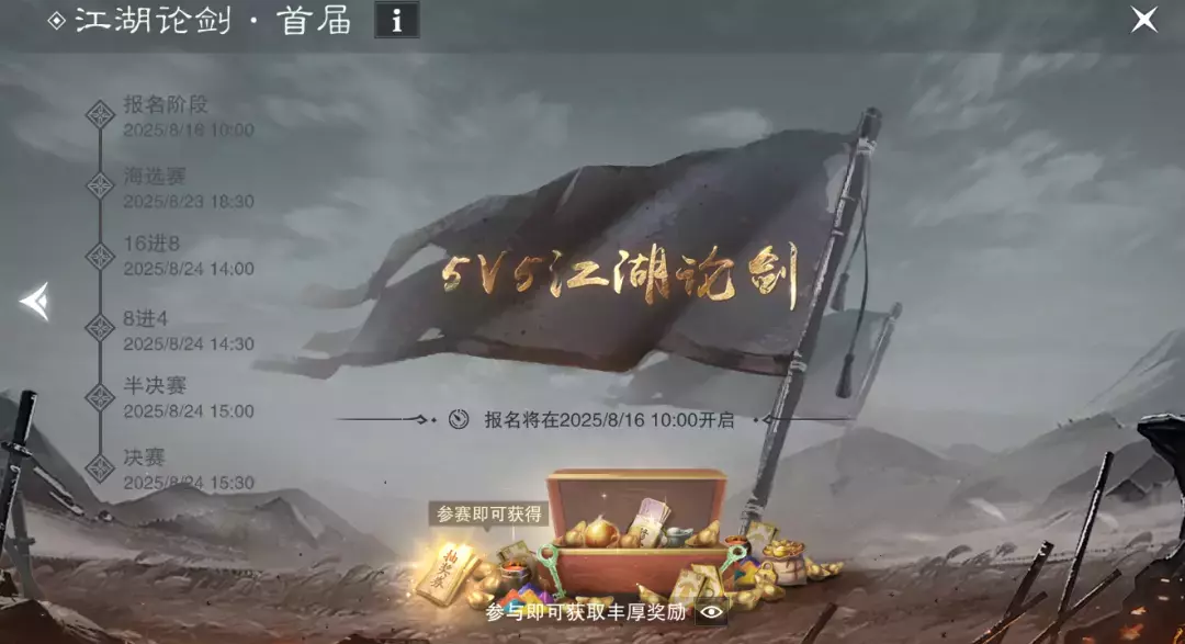 8月15日-8月24日,一梦江湖第一届江湖论剑5V5赛事如约而至——参与即得的抽奖机会、超高价值的奖池档位、极为全面的奖励内容,人人有奖、全民狂欢从不只是一句口号;阶段清晰的赛程、灵活合理的赛制,我们力将这次江湖论剑办到精彩无比!