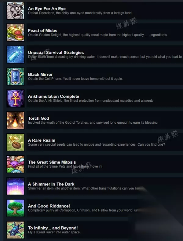 An Eye For An Eye:3个小雪怪皮毛 +1晶状体+少量腐化矿去合成鹿华召唤boss Feast of Midas:金色动物做菜…… Unusual Survival Strategies:淹水到没氧气之后,喝一瓶水…… Black Mirror:制作手机 Ankhumulation Complete:制作十字章护盾这个图标上的玩意儿,之前版本做好了直接解锁,跟手机一样制作起来非常繁杂 Torch God:地下区域放100个左右火把,然后触发一个小事件,存活后得到一个物品使用即可 A Rare Realm:进入特殊种子地图(not the bees!、for the worthy那些) And Good Riddance!:全域无腐化无诅咒无神圣……然后给树妖对话。 以上6个都是过去版本能提前准备的东西,之前玩的深的话很好做 以下是新增的要素 The Great Slime Mitosis:8个城镇史莱姆(宠物)居住到房间里,建议先建8个房间 1、血月钓鱼(概率不高) 2、自然发生的派对 3、地下环境刷摇摇箱子,用金钥匙开(地牢更容易刷出) 4、闪亮史莱姆气球(派对女孩洗澡水,史莱姆女皇掉)丢进新的微光池子,池子尺寸要大,直接投掷进去,不是丢垃圾 5、丢铜头盔到普通史莱姆头上,别开召唤物打死了 6、高度为太空的时候随机刷出,建议骑着坐骑去对话(概率不高) 7、打史莱姆王 8、对着丛林区域随机出现的戴帽子青蛙使用净化粉(概率不高) A Shimmer In The Dark:往微光池子里丢能转换的东西,比如矿石,魔力星,砖块啥的,微光池子可以用10个月锭+1个无限水桶合成微光水桶倒水生成 To Infinity... and Beyond!:在机器人那儿买个无人机,去太空高度飞一下就行,或者地面飞行到太空高度. 以上就是Terraria1.4.4.1新增成就攻略,不要错过。