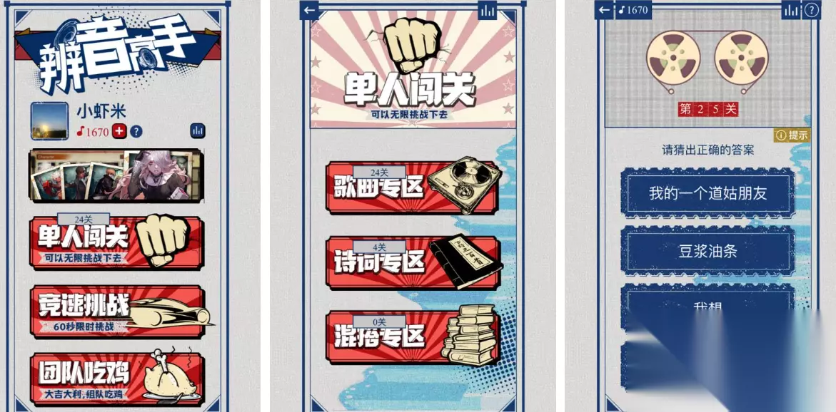 这款竖屏操作的猜歌互动游戏具备优秀的音画,各种流行的曲目和怀旧民谣等待聆听,猜歌互动进行闯关的设定代入感拉满,甚至一些付费的神曲也可以免费聆听进行猜谜,多样的互动猜歌机制吸引了音游爱好者,超多歌曲的呈现给大家提供了听觉快感,如果你对自身音乐储备感到自信,那就在我为猜歌狂这款闯关作品中挑战吧。 高速下载 普通下载 3、《辨音高手》