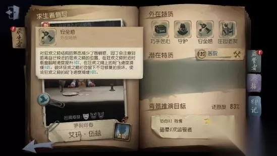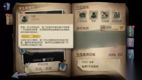 首先是第一个特质——巧手匠心,说白了就是拆椅子。现在的拆椅子技能是改版之后的,无论场上剩余多少椅子,拆椅子的速度都是一样快的,大约三四秒就能拆完一个椅子,不过有了冷却CD,但整体较改版之前还是有一定的增强的 [守护]